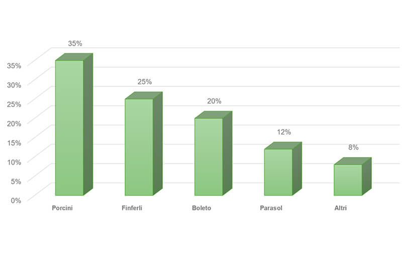 Tra le varietà più tipiche ci sono porcini, finferli, boleto baio, parasole e russule.