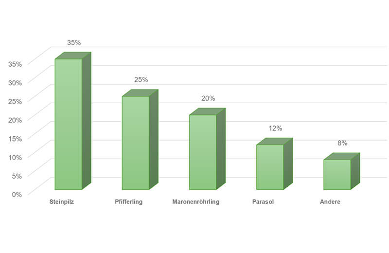 Einige Pilzarten sind besonders begehrt und werden beim Pilze sammeln häufig gefunden. Das nachfolgende Diagramm zeigt eine Übersicht der beliebtesten Pilzarten in Südtirol. Am begehrtesten sind eindeutig die Steinpilze, gefolgt von den Pfifferlingen. Auch Maronenröhrlinge sind sehr beliebt, ebenso wie der Parasol, der etwas seltener vorkommt, aber durch seine Größe sofort auffällt.
